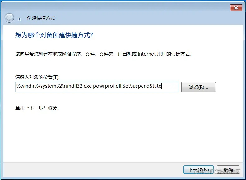 2.在创建快捷方式对话框中的对象位置文本框,输入“%windir%\system32\rundll32.exe powrprof.dll,SetSuspendState” (不要引号),这是创建休眠功能的命令,然后“下一步”。