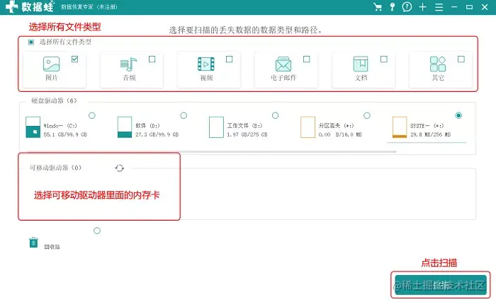 步骤1:打开软件界面,会出现注册界面,可以先暂时关闭。选择所有文件类型,再选择可移动驱动器里面的内存卡。点击【扫描】。