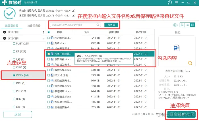步骤3:深度扫描结束,会出现更多内容数据。在【筛选框】输入文件名称或者保存路径可以直接寻找文件。找到文件后选择好(鼠标箭头悬放在文件上方,可以看到它的相关信息)。选择【恢复】。