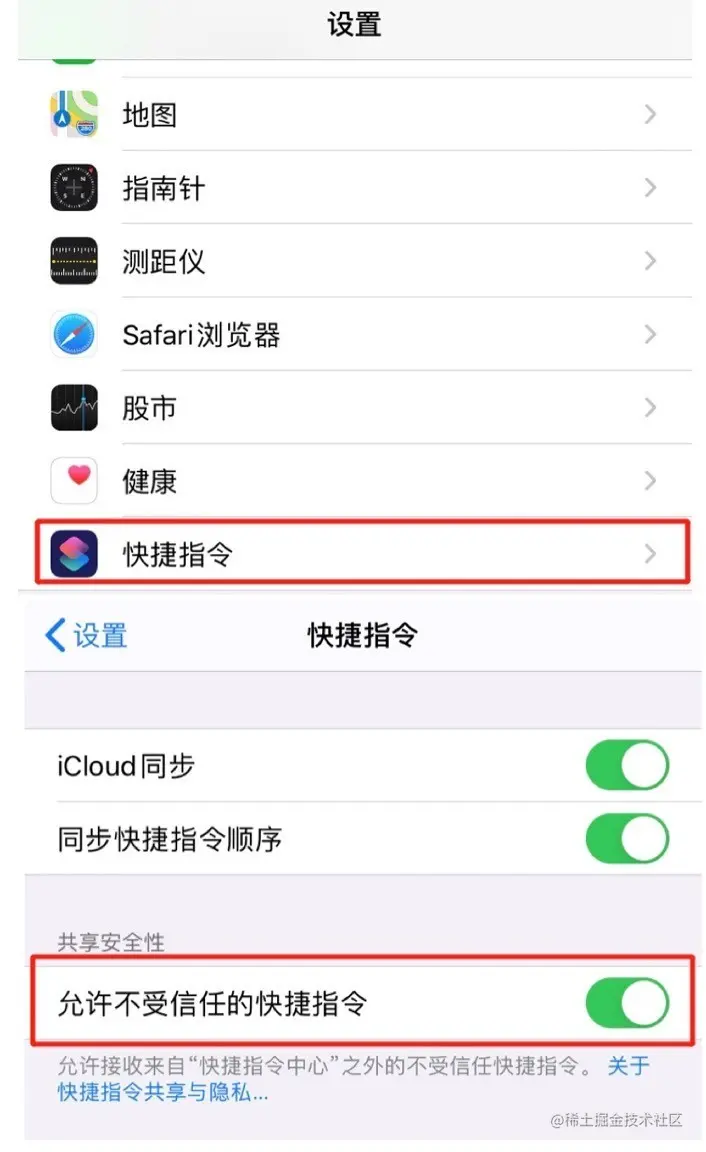 首先打开“设置——快捷指令——打开允许不受信任的快捷指令”。