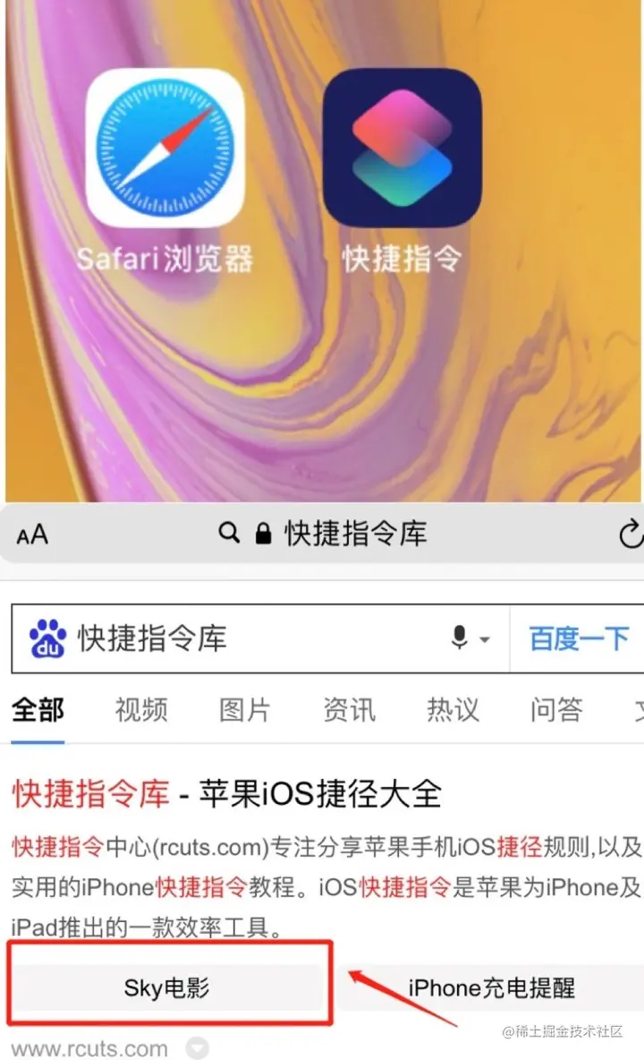 第二步打开Safari浏览器搜索快捷指令库,下滑找到Sky影视快捷指令,点击进入。
