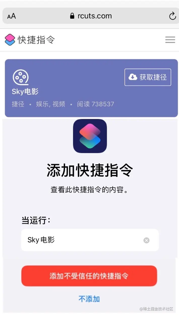 第三步点击“获取捷径”,点击最底端“添加不信任快捷指令”。