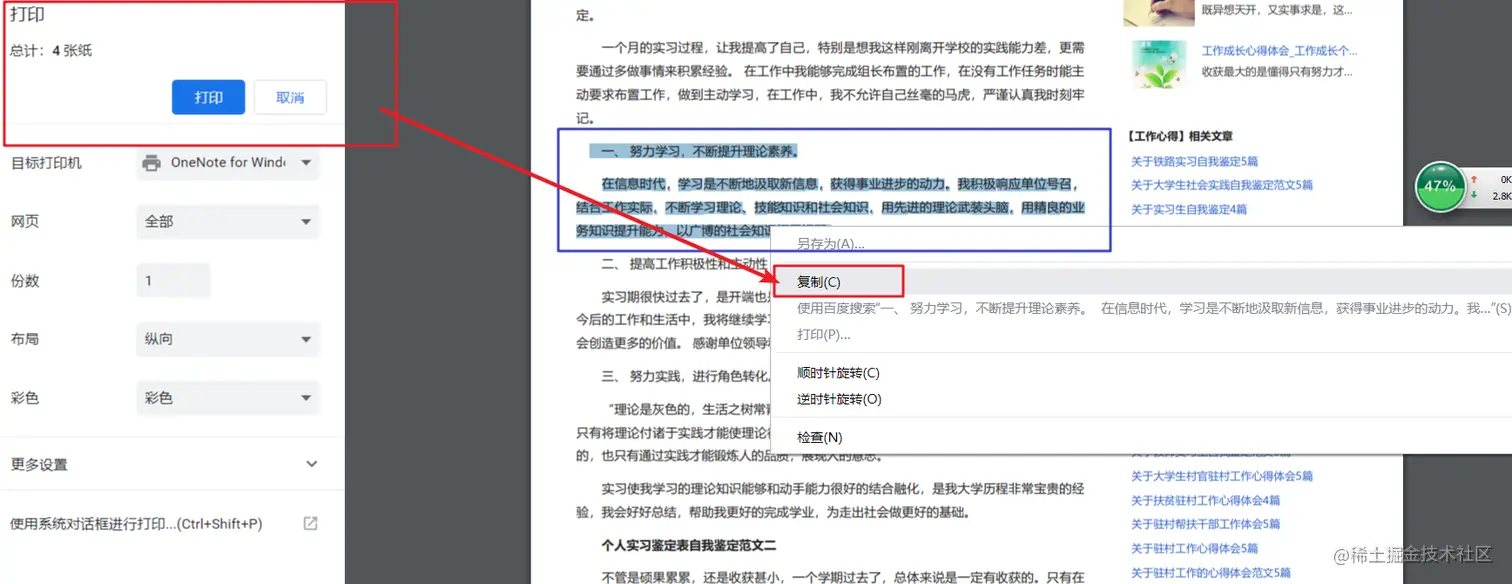 在需要复制文字的界面鼠标右键选择打印或者使用快捷键Ctrl+P,打开打印界面,在打印界面就可以进行复制操作啦!