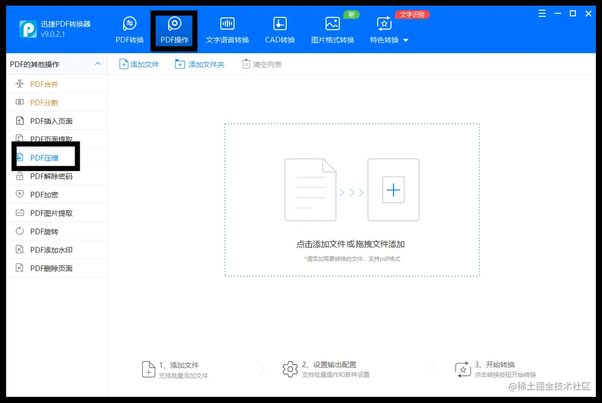 步骤一:首先打开PDF转换工具,进入首页之后,在上方菜单栏中点击“PDF操作”按钮,接着在左侧列表中点击“PDF压缩”按钮。