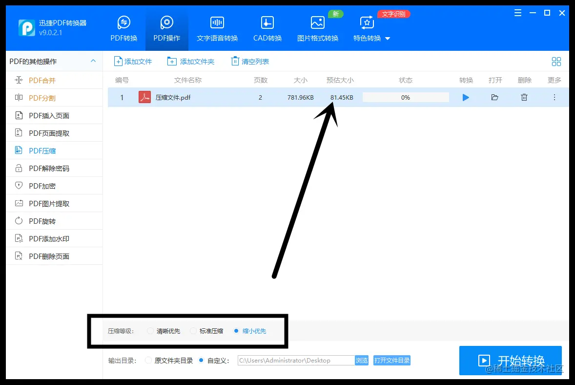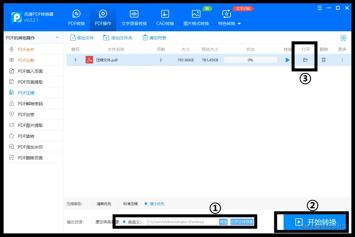 步骤四:选择好压缩模式之后,在正下方就可以先设置文件输出目录了,然后点击右下角的“开始转换”按钮,等状态栏进度达到100%之后点击文件后方的“打开”即可查阅压缩后的PDF文件,是不是很简单呢。
