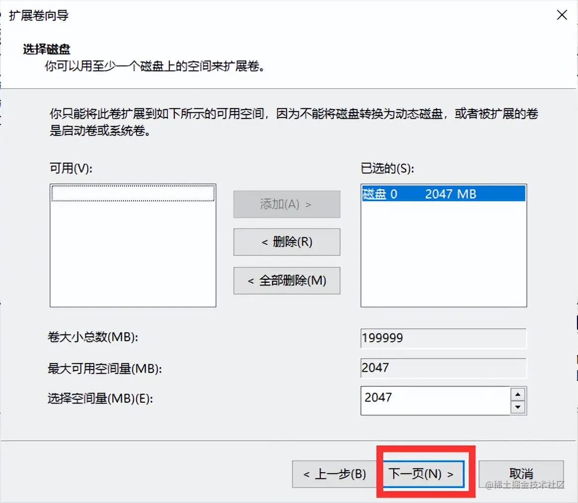 步骤3: 进入【扩展卷向导】界面后,点击【下一页】。
