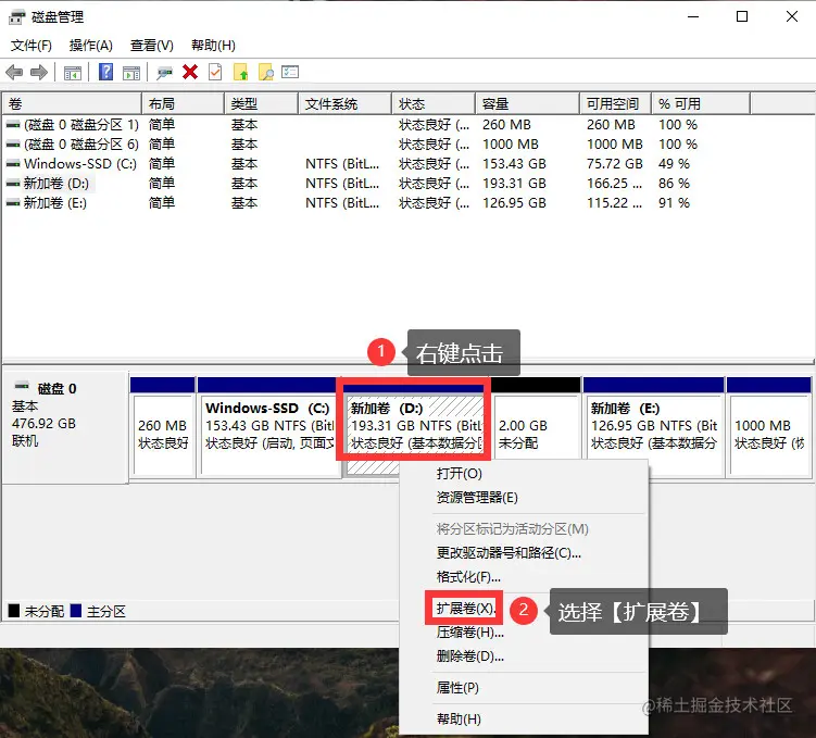 步骤2: 找到需要合并的磁盘,右键点击,选择【扩展卷】选项。