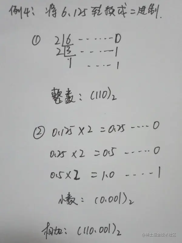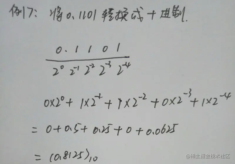 注: 如果小数的整数部分有大于0的整数时,将整数转换成二进制,小数转换成二进制,然后加在一起。