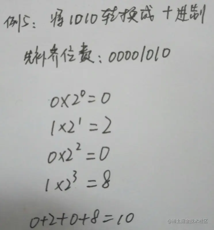 若首位是0的正整数,补齐位数以后,将二进制中的位数分别与对应的值相乘,然后相加得到的就为十进制。
