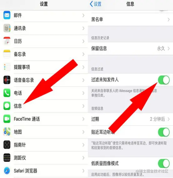 开启步骤:设置—信息—开启过滤位置发件人。