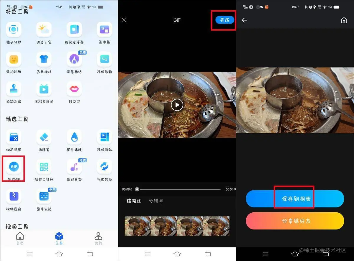 这是我们手机上的一个软件,我们打开软件,在软件的功能选择页面,找到 “制作GIF“ 的选项,找到之后,我们上传一段较短的视频文件。上传好之后,点击右上角的 ”完成“ 按钮等待生成即可。生成后的文件,我们可以直接保存到相册。