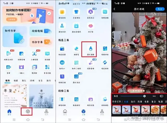 点击打开我们手机上的软件,进入到软件的首页,找到精选工具里面的 【图片滤镜】 选项。上传我们手机上的图片文件,在下方各种各样风格的滤镜中选择一款喜欢的滤镜,调整其强度,点击 【导出】 即可获得调色后的图片。