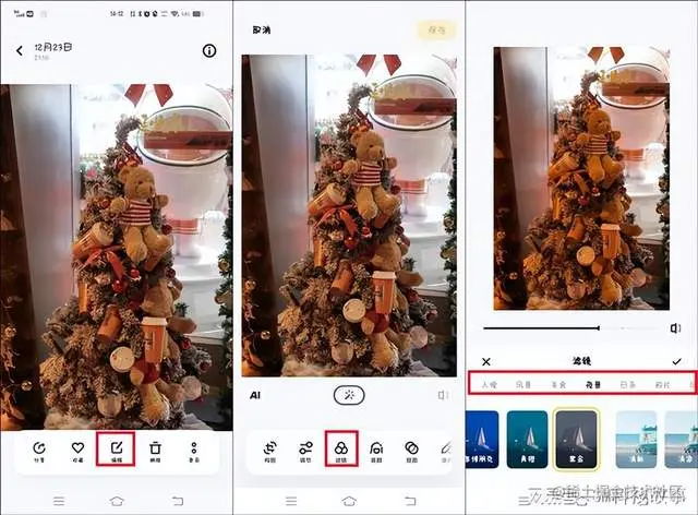 很多时候一些基础的图片编辑操作我们都是可以在手机相册上完成的。点击打开手机相册,找到图片所在的位置,点击 【编辑】-【滤镜】 选项。在弹出的滤镜页面中选择一款合适的滤镜,并且将其调整到合适的强度,保存即可。
