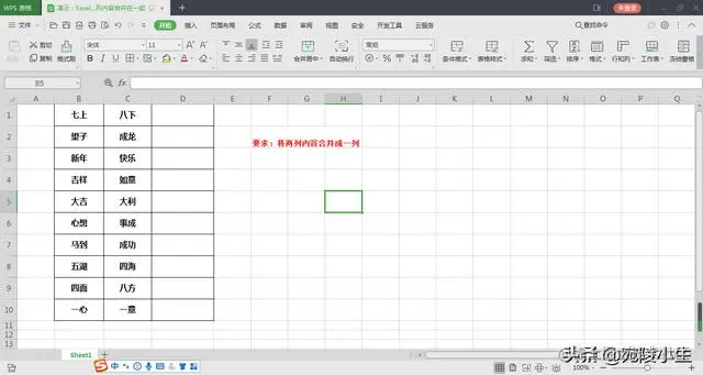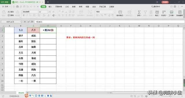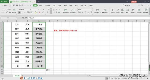 excel合并两列内容_办公教程:Excel如何快速将两列内容合并成一列 冲冲冲冲冲呀 2023-05-10 738 阅读1分钟 Excel如何快速将两列内容合并成一列 工作中会遇到将表格中两列内容合并在一起的情况,Excel中这种很容易实现,今天就和大家一起学习。 方法/步骤 第一步,首先打开需要编辑的数据表格。 第二步,在合并列第一个单元格中使用连接符 "&",将待合并的两列内容链接起来。案例中公式为 "=B1 & c1"。 第三步,鼠标放置在D1右下角,待鼠标变成 + ,拖拉鼠标复制填充公式,使所有表格合并。 总结:两列内容合并成一列,主要是用:连接符&(shift+7)来实现的。