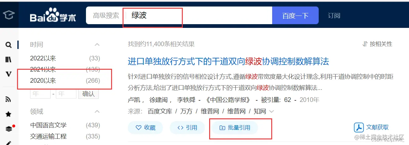 可在百度学术网站输入关键字(例如“绿波”)查找文献,时间一般选择“近三年”,点击“批量引用”。