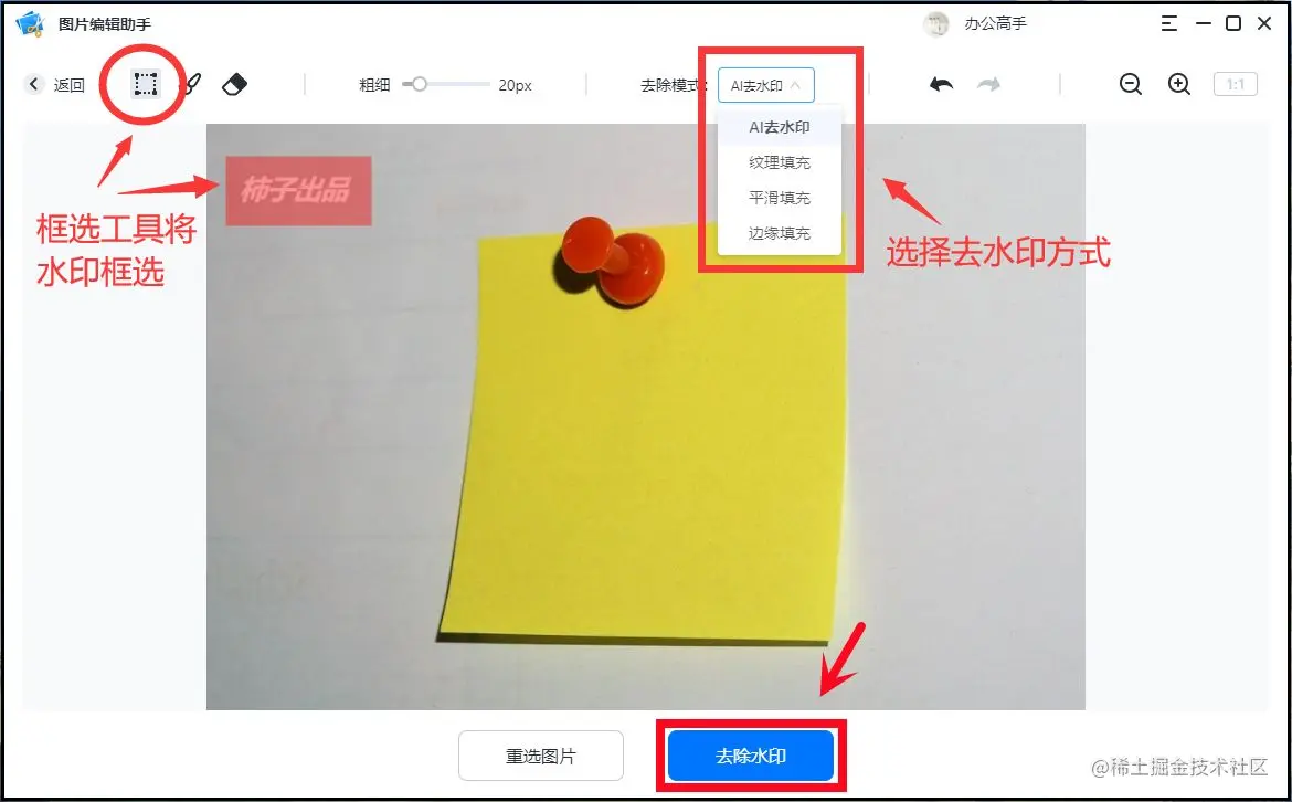 这也是一个能够去除图片水印的工具,使用它去除水印的步骤也非常简单。打开软件,将含有水印的图片导入,然后使用选择工具框选出水印区域。点击“去水印”按钮,就会自动去除图片中的水印。需要注意的是,它的去水印功能并不是100%的完美,有些情况下可能会留下一些痕迹或瑕疵。但总体来说,这个功能还是非常实用的。