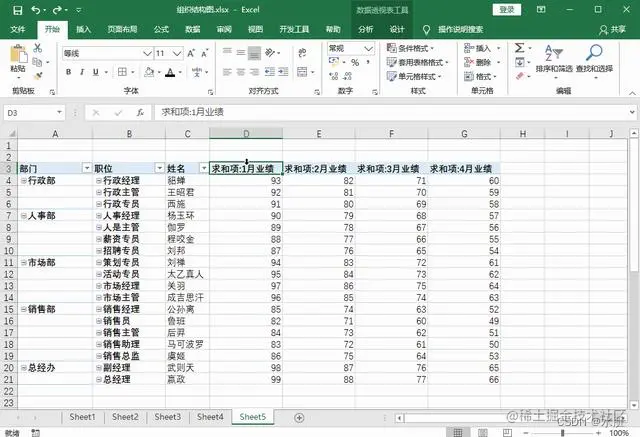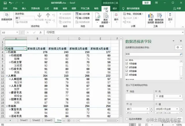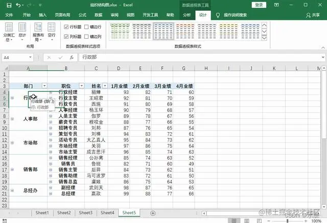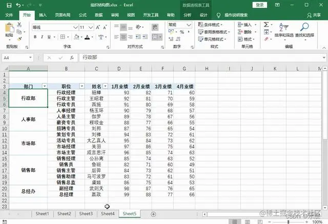 5、在透视表的任何区域,鼠标右击选择【数据透视表选项】,然后勾选【合并且居中排列带标签的单元格】,点击【确定】,可以看到部门就会以合并单元格的方式显示。