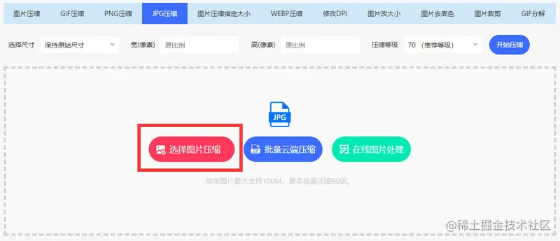 点击上传图片,最大可处理单张≤100M大小图片,或者批量60张图片压缩。