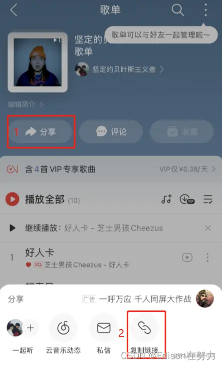 1、打卡歌单,点击分享,点击复制链接,将链接粘贴至聊天对话框,复制 &id 后面的字段,以我的歌单链接为例,复制得到 7190573929