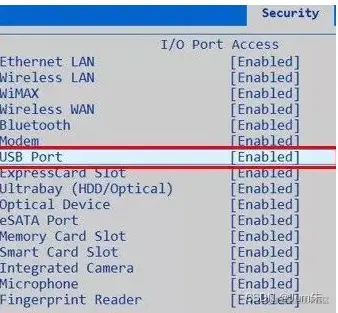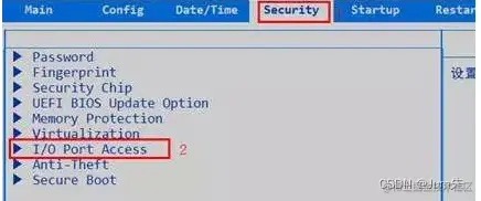 1、一般来说,重启电脑不断按下BIOS快捷键就可以进入BIOS界面。进入BIOS界面后,使用方向键切换至“Security”选项卡,选择“I/O Port Access”并回车。