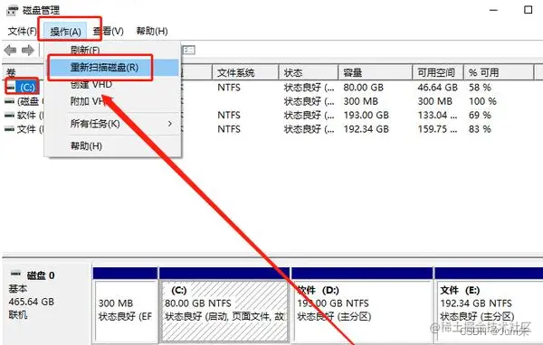 2、然后选中U盘,点击工具栏的【操作】,选择【重新扫描磁盘】进行修复即可。