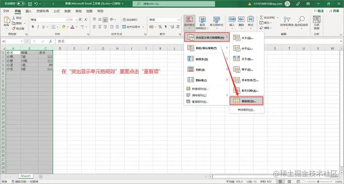 步骤2.在上方菜单栏中的【开始】里面点击“条件格式”,随后选择“突出显示单元格规则”后点击“重复项”;