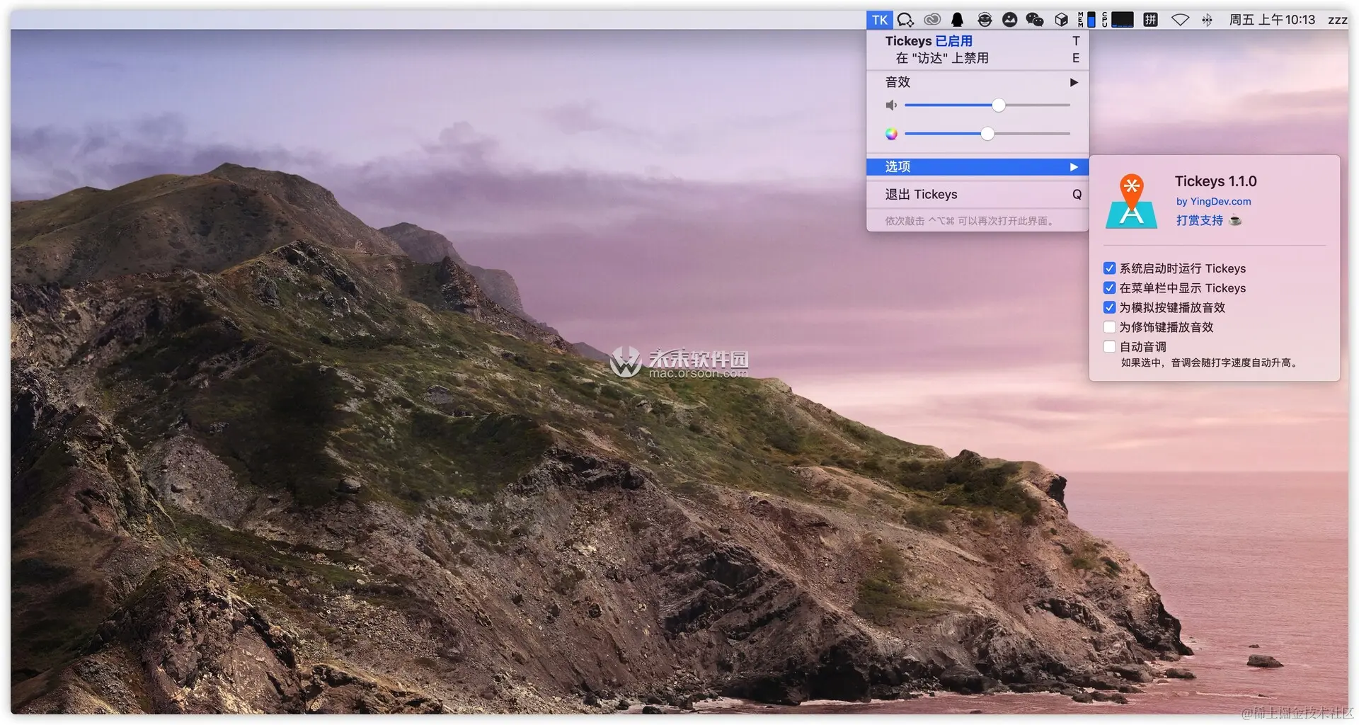 tickeys mac 中文版是一款适用于 Mac 的键盘音效工具,可以在打字时模拟打字机的声音。内置冒泡、机械键盘、打字机、剑气、Cherry G80-3000、Cherry G80-3494、爆裂鼓手键盘音效,如果你经常在深夜写作,不妨尝试一下这个键盘音效小工具 - Tickeys。