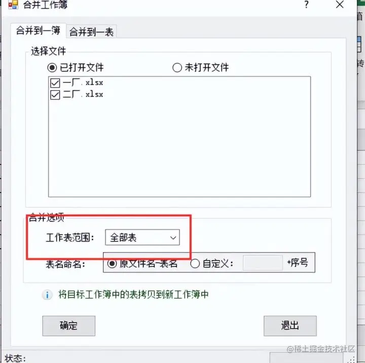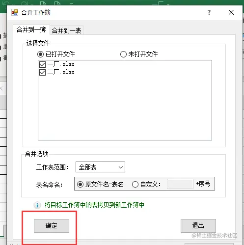 excel怎么把两个表格合成一个 冲冲冲冲冲呀 2023-05-10 316 阅读1分钟 1.领导发给小王两份工作簿,让小王将这两个表格快速的合并到一起。 2.点击下图选项(Excel工具箱,百度即可了解详细的下载安装信息,本文这里就不做具体解说) 3.然后点击【汇总拆分】,选择【合并多簿】 4.点击【合并到一簿】,然后勾选【已打开文件】,最后选择这份文件。 5.最后点击【确定】即可完成 6.完成效果如下图