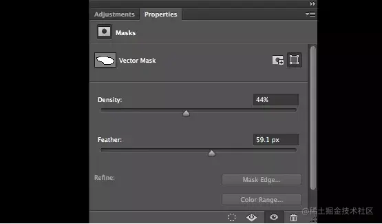 创建一个像素蒙版或矢量蒙版后,可通过其属性面板上的浓度滑块调整图片的可见度,还可以完全无损地为边缘添加羽化。