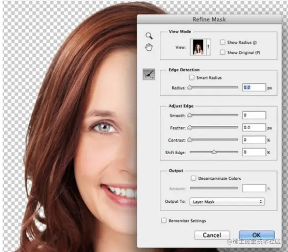 对于较复杂的部分可利用蒙版边缘选项来优化边缘质量。在处理头发时,蒙版边缘对话框中最有效的设置组合为智能半径、移动边缘和净化颜色选项。