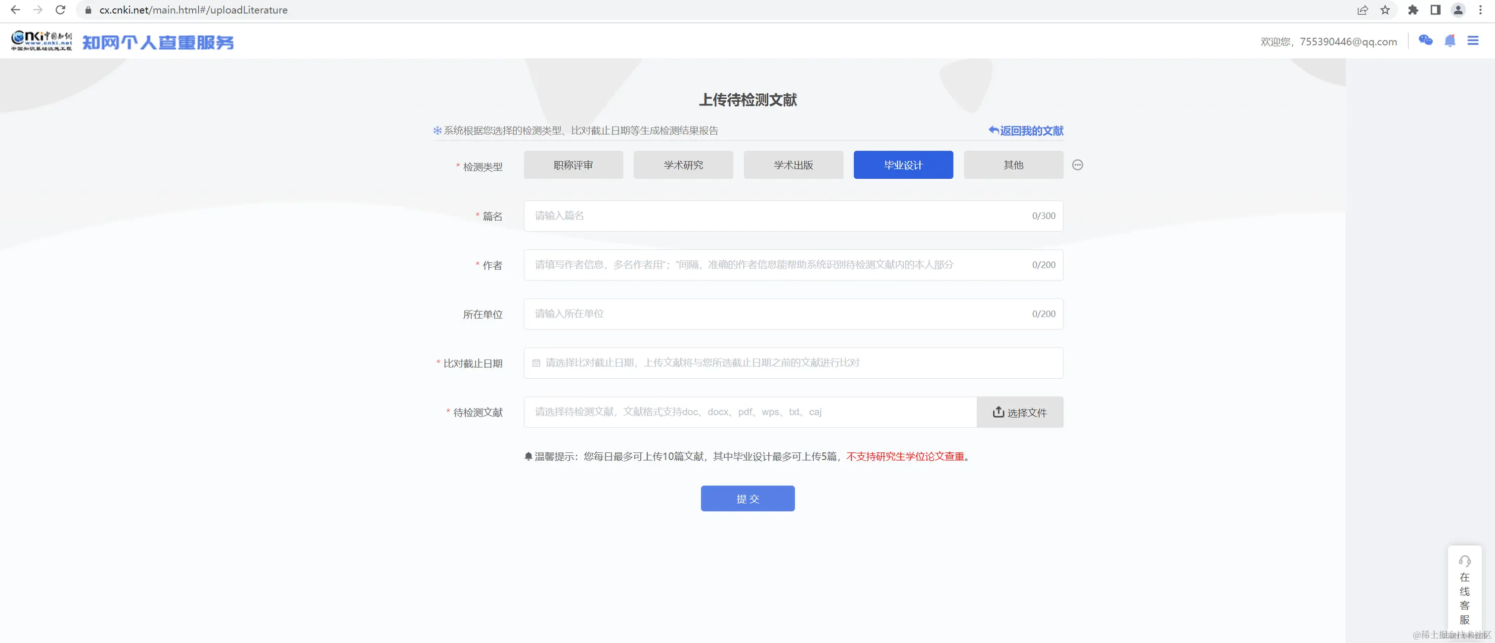 点击上传待检测文献,选择你所需要的内容,并上传你的论文