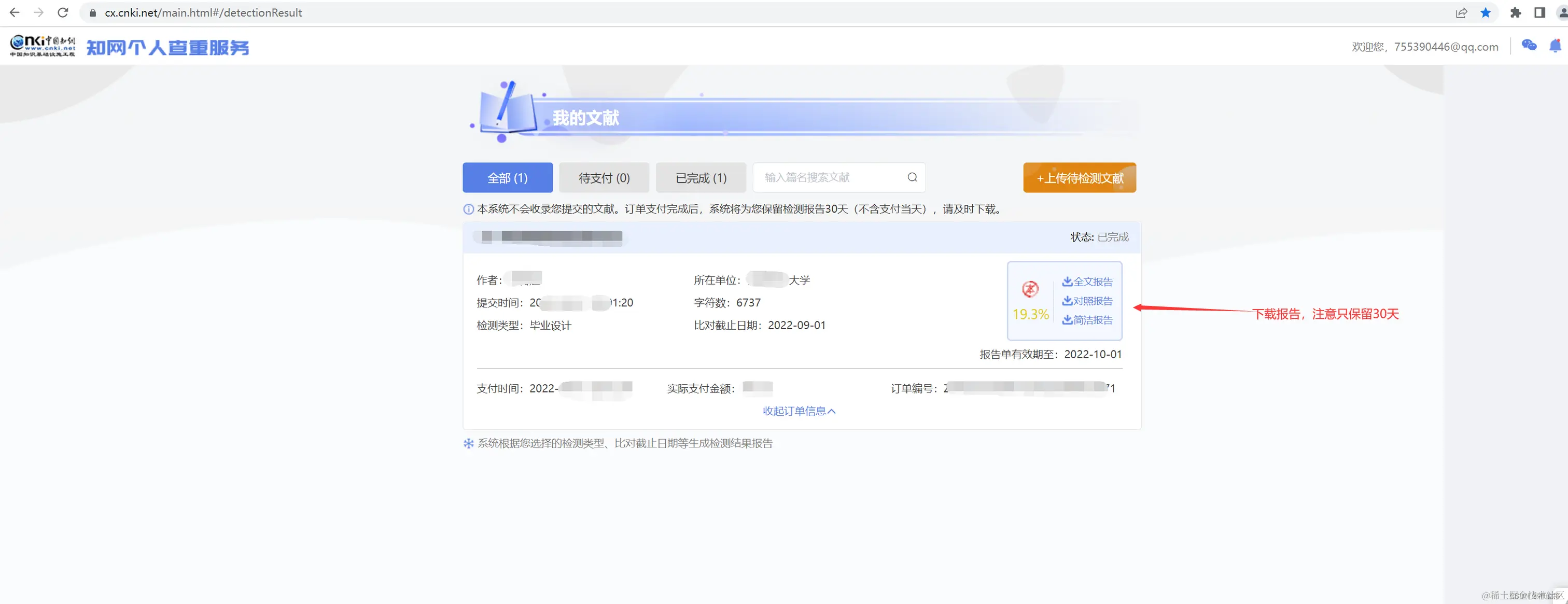 等待结果出来后,下载查重结果,注意这边只会保留30天的查重结果。