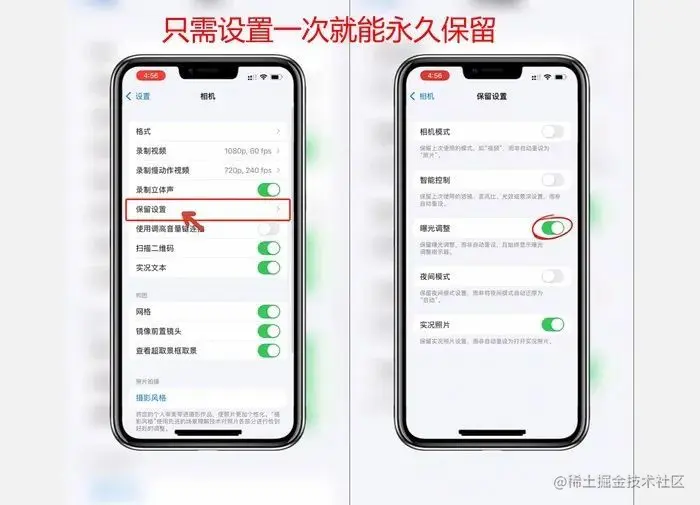 这样,一个拍啥都好看的苹果原相机就设置好啦!这时有朋友会问,是不是每次拍照之前都要调整一次参数?漏!只需同样在设置中的相机部分找到【保留设置】,将【曝光调整】的按钮打开就可以长期保存设置啦!