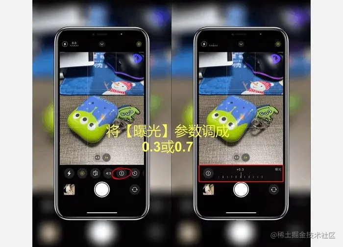 然后就是在相机内进行操作了,打开相机上滑调出二级菜单,点击(+-)符号形状的【曝光】选项,将曝光的参数调成0.3,如果光线太暗或夜间开闪光时可以调成0.7。