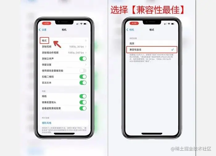 首先在我们手机的设置中找到【相机】,在第一个【格式】选项内选择【兼容性最佳】。