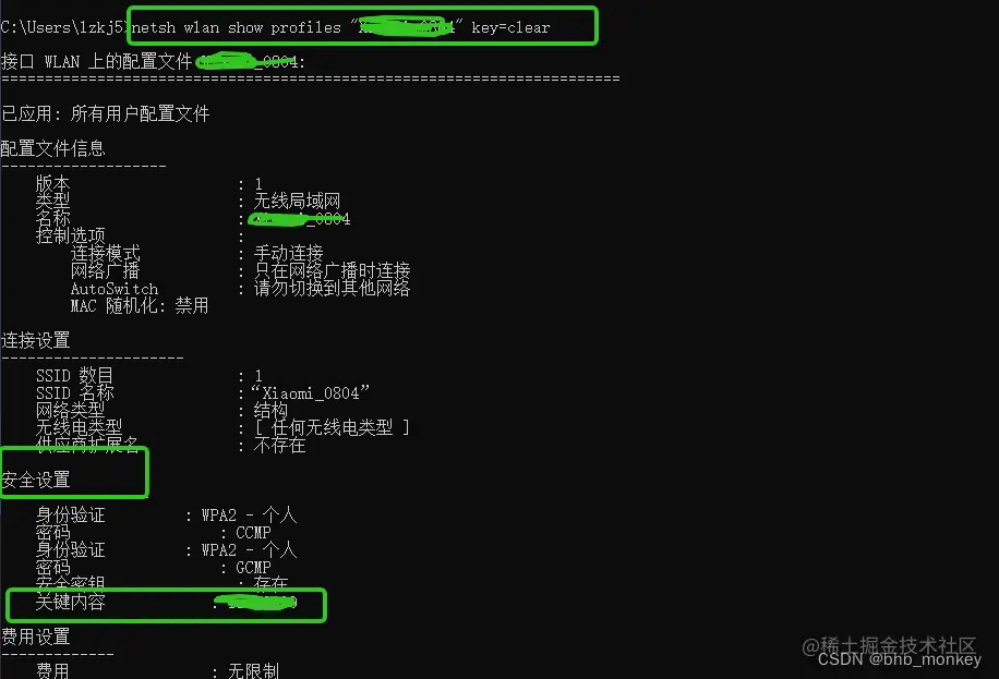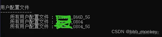 破解获取wifi密码 码农阿宇 2023-05-10 678 阅读1分钟 第一步 : 输入cmd 第二部:输入命令(查看WiFi名字)netsh wlan show profiles (用户配置文件就是附近的WiFi名字) 第三步:输入命令netsh wlan show profiles “WiFi名称” key=clear,回车 (关键内容就是密码)