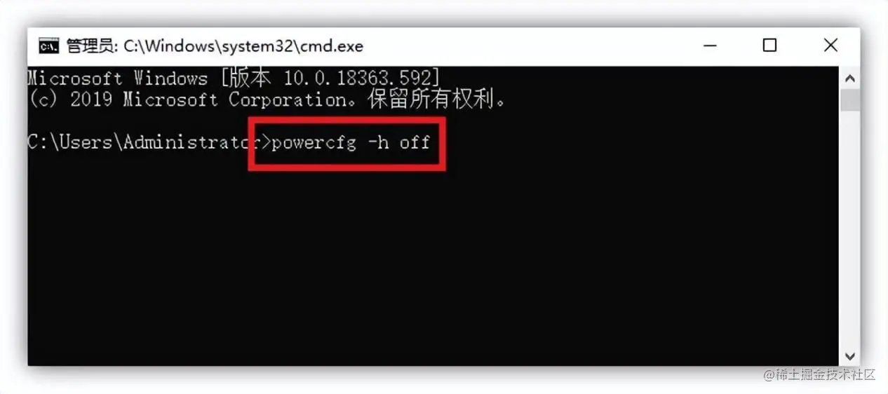 然后会进入管理员面板,在里面输入“powercfg -h off”命令,然后按回车键重启,这样可以为电脑腾出一些存储空间。