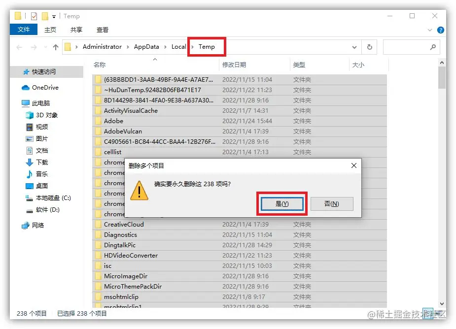通过这个命令,可以直接打开“temp”文件夹,直接按【Ctrl A】全选临时文件,再按【Shift Delete】永久删除,释放更多空间。