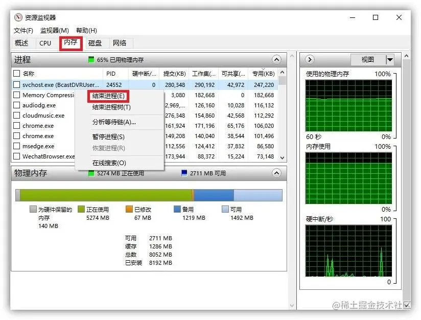 然后点击最下方的【打开资源监视器】,进入后查看哪个应用程序占用内存最多,鼠标右键点击【结束进程】。