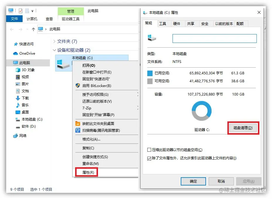 电脑死机很可能是因为C盘空间不足,长期使用会产生大量的缓存垃圾。因此,您需要打开【本电脑】,右击C盘,选择【属性】,然后点击【磁盘清理】。