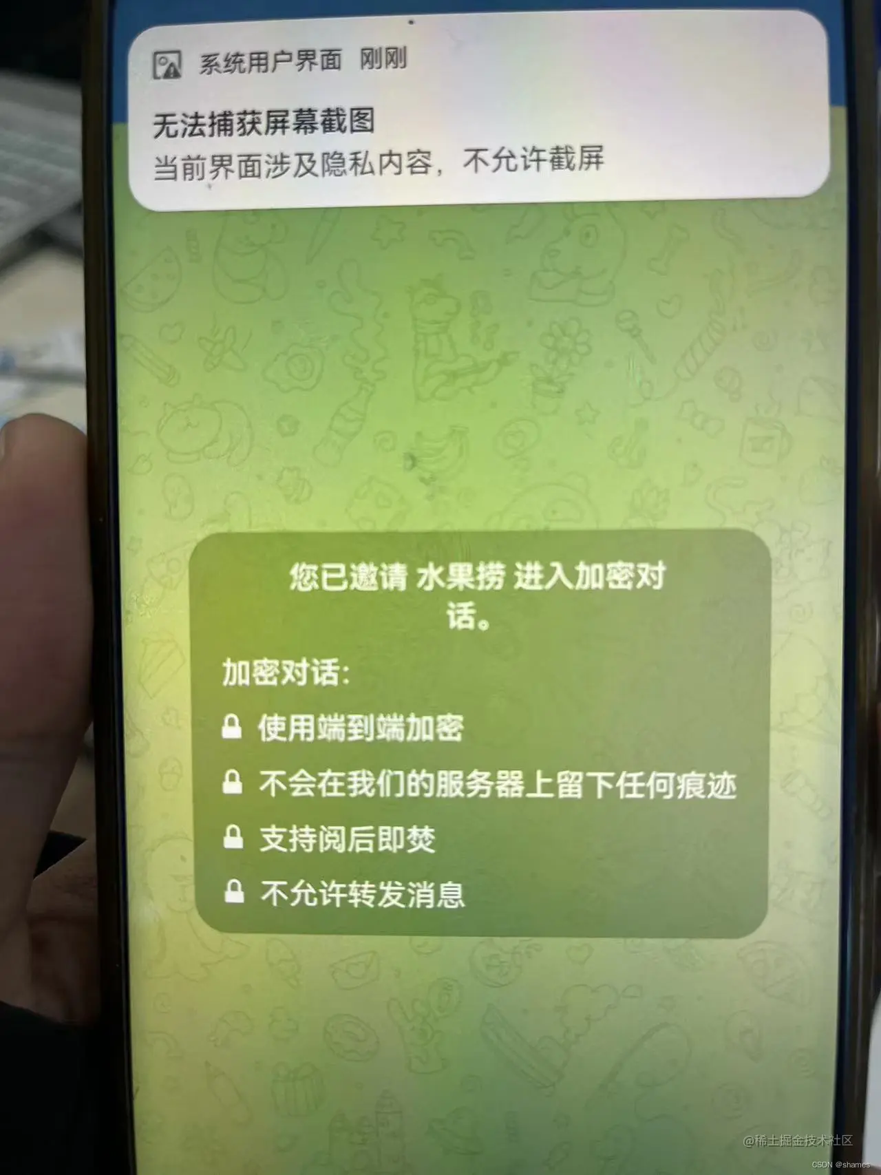 Telegram还有秘密对话功能,它会弹出另一个对话框,系统强调不会在服务器上留下任何痕迹,也可以设定信息读取后几秒甚至一周时间,信息自动销毁,如果对方想截图,系统也会弹出无法截图的提示。安全性十分高,您只需要点击好友的头像,点击右上角的三个点后弹出的菜单中找到开始密聊即可。