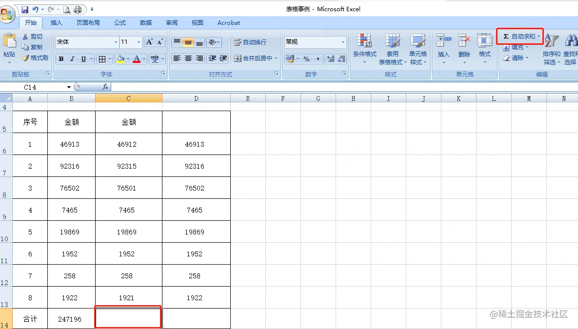 在EXCEL表格中快速自动求和 码农阿宇 2023-05-10 466 阅读1分钟 方法一:1、选中需要计算的数据 2、在“开始”选项卡下找到“自动求和”点击即可 方法二:选中所要求和的行或列,按键盘快捷键“Alt+=”即可完成求和