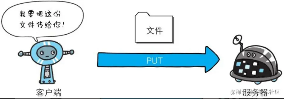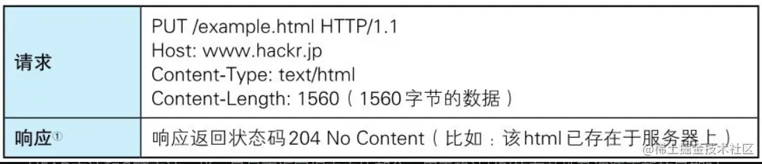 PUT:传输文件PUT方法用来传输文件。就像FTP协议的文件上传一样,要求在请求报文的主体中包含文件内容,然后保存到请求URI指定的位置。但是,鉴于HTTP/1.1的PUT方法自身不带验证机制,任何人都可以上传文件,存在安全性问题,因此一般的Web网站不使用该方法。若配合Web应用程序的验证机制,或架构设计采用REST(Representational State Transfer,表征状态转移)标准的同类Web网站,就可能会开放使用PUT方法。