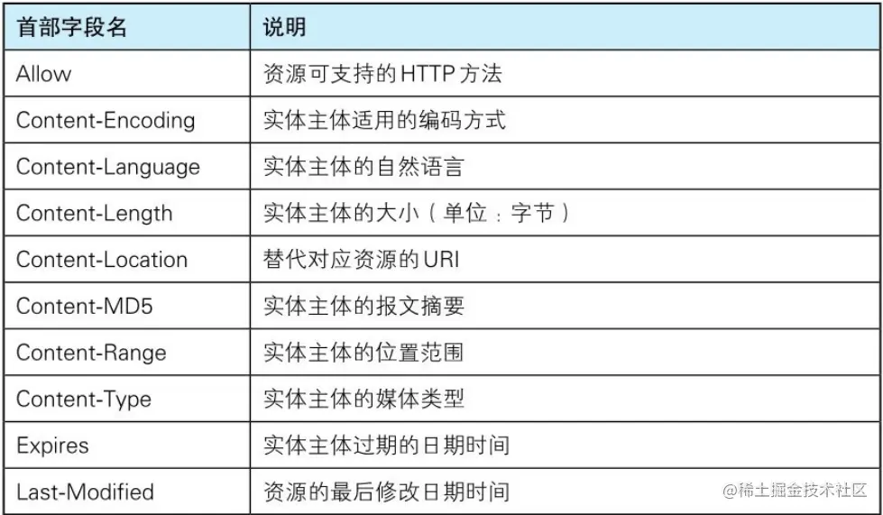 针对请求报文和响应报文的实体部分使用的首部。补充了资源内容更新时间等与实体有关的信息。
