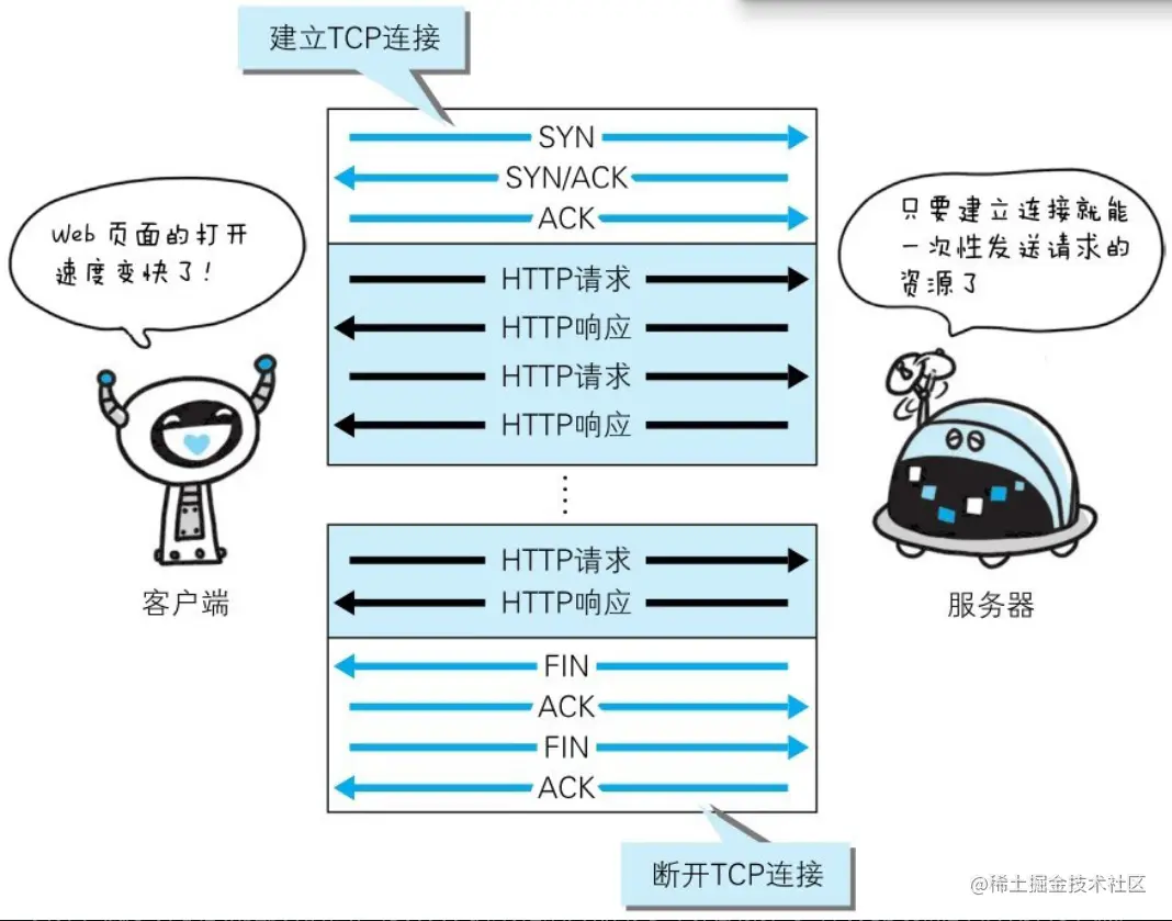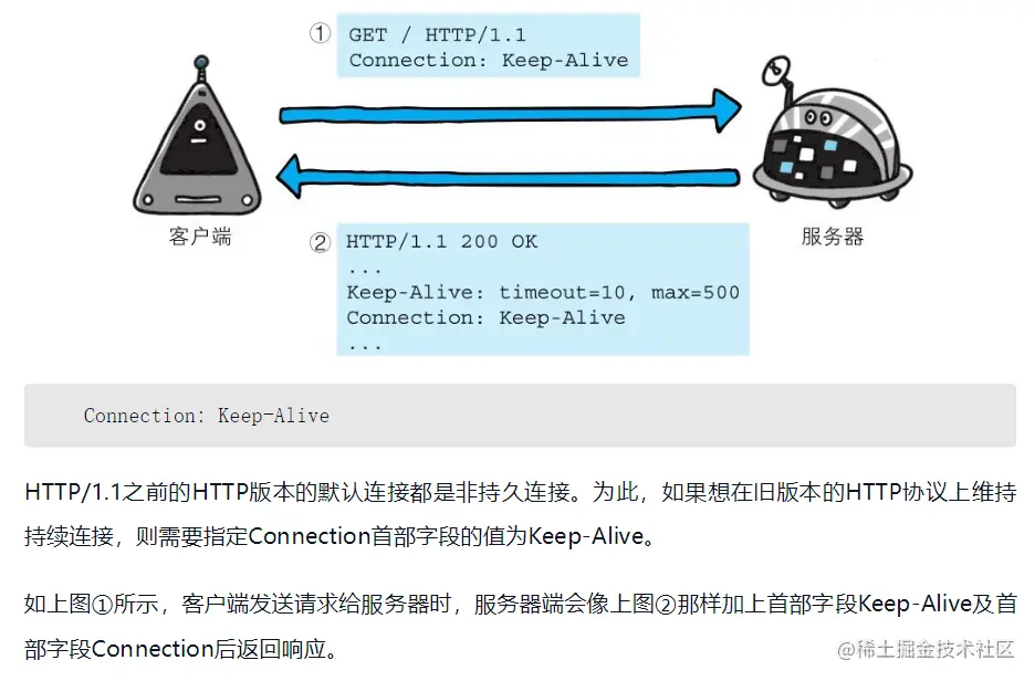为解决上述TCP连接的问题,HTTP/1.1和一部分的HTTP/1.0想出了持久连接(HTTP PersistentConnections,也称为HTTP keep-alive或HTTP connection reuse)的方法。持久连接的特点是,只要任意一端没有明确提出断开连接,则保持TCP连接状态。