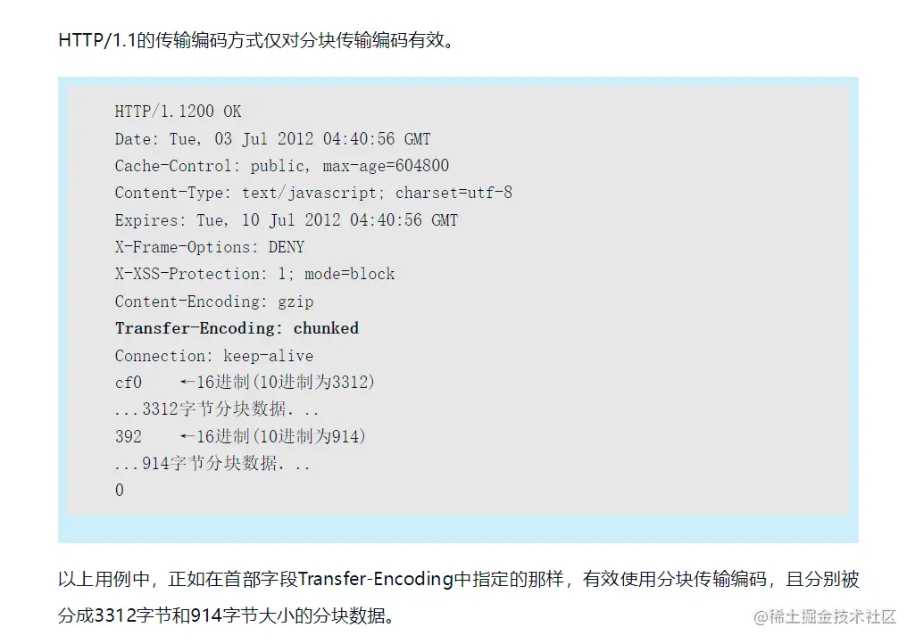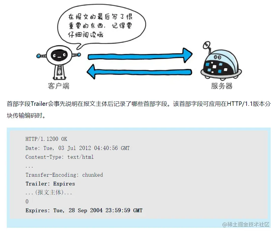 以上用例中,指定首部字段Trailer的值为Expires,在报文主体之后(分块长度0之后)出现了首部字段Expires。
