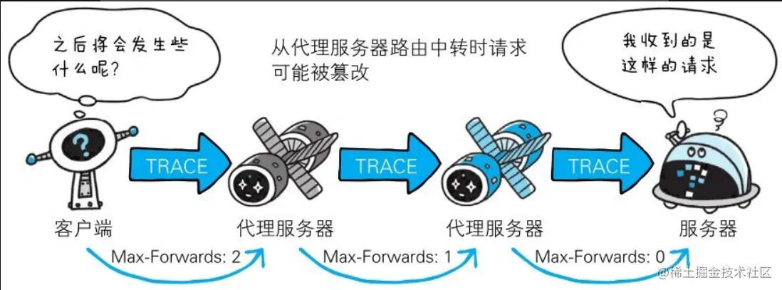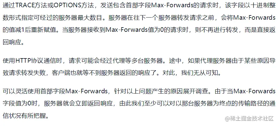 TRACE方法是让Web服务器端将之前的请求通信环回给客户端的方法。发送请求时,在Max-Forwards首部字段中填入数值,每经过一个服务器端就将该数字减1,当数值刚好减到0时,就停止继续传输,最后接收到请求的服务器端则返回状态码200 OK的响应。客户端通过TRACE方法可以查询发送出去的请求是怎样被加工修改/篡改的。这是因为,请求想要连接到源目标服务器可能会通过代理中转,TRACE方法就是用来确认连接过程中发生的一系列操作。但是,TRACE方法本来就不怎么常用,再加上它容易引发XST(Cross-Site Tracing,跨站追踪)攻击,通常就更不会用到了。