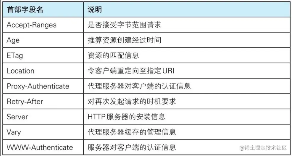 从服务器端向客户端返回响应报文时使用的首部。补充了响应的附加内容,也会要求客户端附加额外的内容信息。