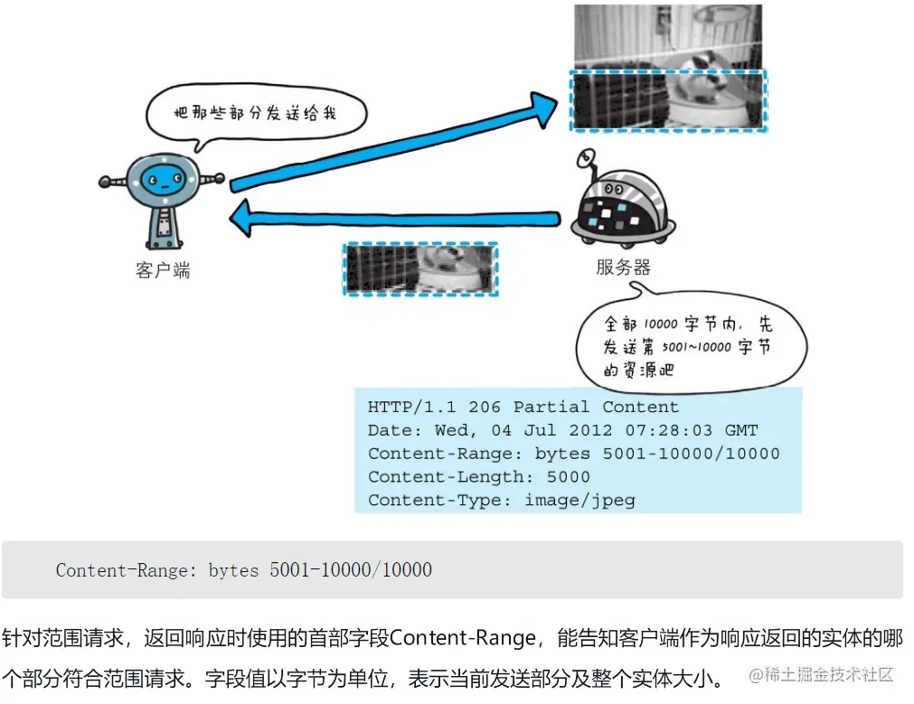该状态码表示客户端进行了范围请求,而服务器成功执行了这部分的GET请求。响应报文中包含由Content-Range指定范围的实体内容。