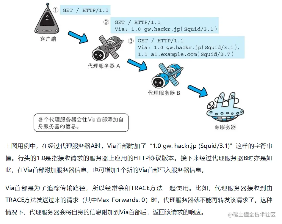 报文经过代理或网关时,会先在首部字段Via中附加该服务器的信息,然后再进行转发。这个做法和traceroute及电子邮件的Received首部的工作机制很类似。